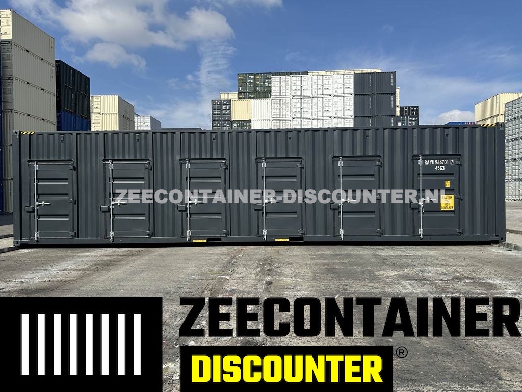 De 40ft high-cube zeecontainer met 6 zijdeuren is speciaal ontworpen voor opslag op locatie van goederen. De container is opgedeeld in 6 verschillende compartimenten voorzien van ene toegangsdeur met afmetingen 111cm breed x 188cm hoog. De deuren zijn voorzien van een slotkast. Container is ontworpen self-storage verhuur. Standaard uitgevoerd in RAL7016 antracietgrijs. Tussenwanden zijn van staal en niet te verwijderen.